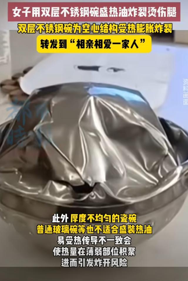 近日,湖北恩施。一女子使用双层不锈钢碗盛放热油时,碗突然炸裂致腿部烫伤。据悉,双层不锈钢碗内部为空心结构,接触高温热油后,内部气体受热膨胀,再叠加温差影响,易发生爆裂。
